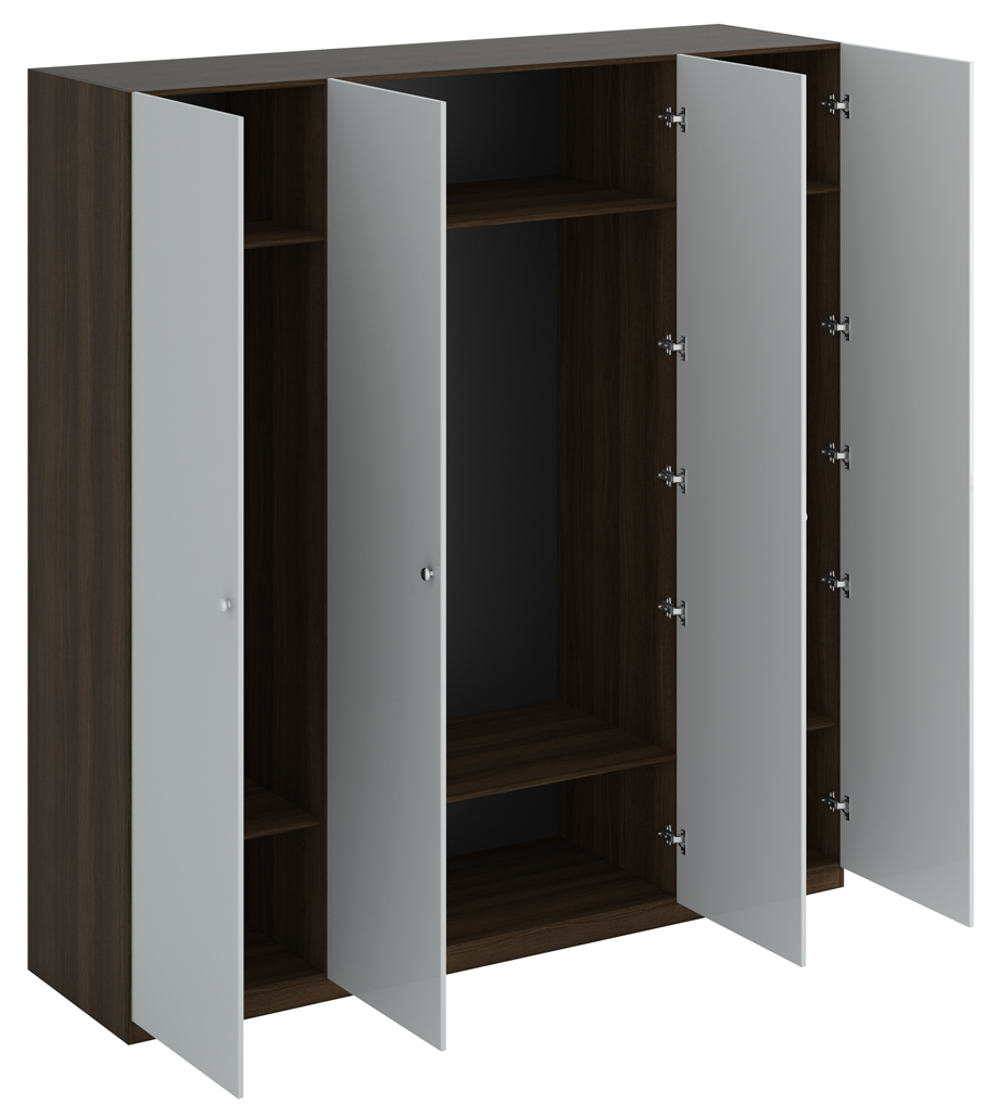 Шкаф четырехдверный состоит их трёх отделений. В отделениях расположены верхние стационарные и нижние съемными полки. Шкаф установлен на регулируемые опоры. Данную мебель рекомендуется крепить к стене.